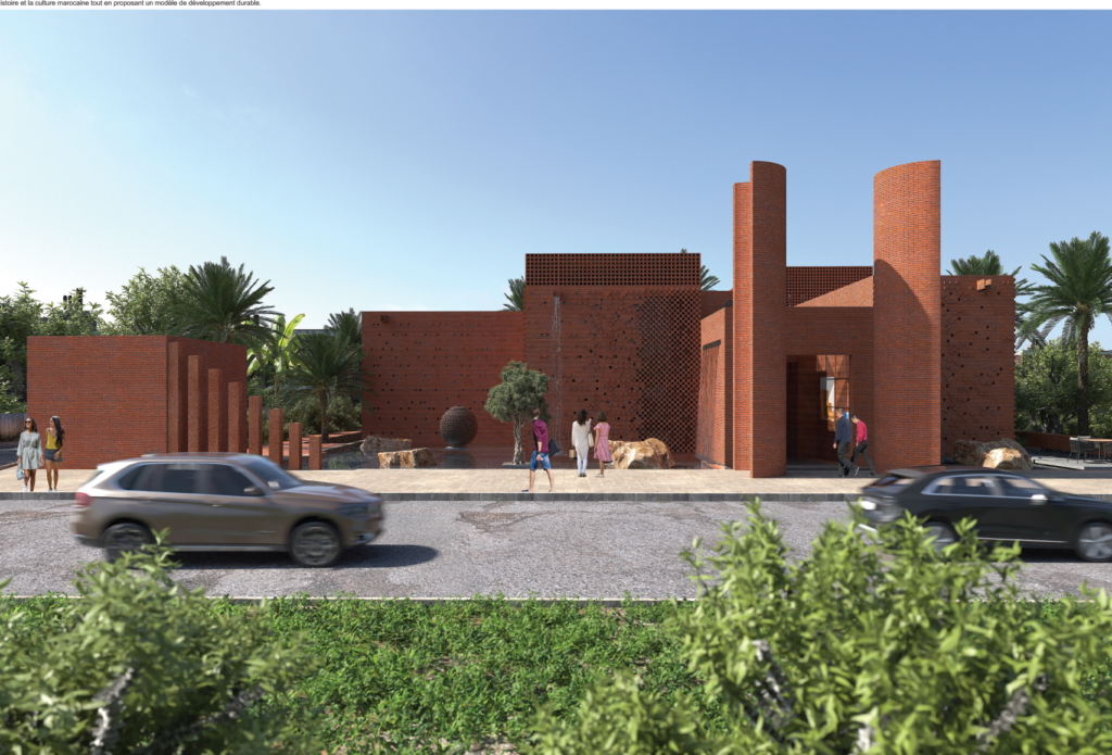 Le projet classé premier, porté par l’architecte Tarik Zoubdi, a particulièrement retenu l’attention du jury par la force de son parti architectural. L’approche développe une composition extérieure structurée, nourrie d’un vocabulaire géométrique inspiré de Mondrian, donnant naissance à une façade rythmée par des jeux de volumes, de profondeurs et d’ombres portées. Cette enveloppe architecturale est enrichie par une seconde strate composée de motifs sculptés, évoquant une spirale d’or et une skyline abstraite de Marrakech. Ce dispositif donne au bâtiment une dimension culturelle et pédagogique tout en proposant une réinterprétation contemporaine du patrimoine géométrique de la ville. L’ensemble affirme une écriture sobre, expressive et ancrée dans son contexte, à mi-chemin entre mémoire et modernité.