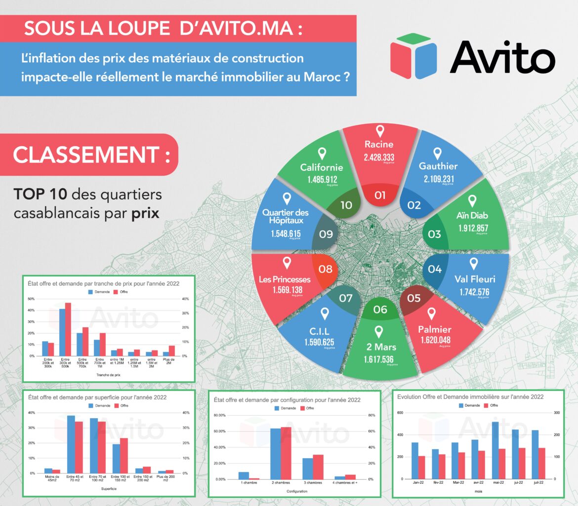 En effet, les annonces actives sur la plateforme Avito.ma reprennent une évolution positive de 5% durant les sept premiers mois de 2022 après une baisse de 5% durant la même période de 2021. La demande, quant à elle, s’est accrue de 9% entre janvier et juillet 2022 par rapport à la même période de 2021 où elle avait perdu 9%. Concernant les prix, ils ont connu une régression de 6% à fin juillet 2022 comparé à la même période de l’année 2021 durant laquelle les prix avaient augmenté de 3%. Résultat : la moyenne des prix affichés par les annonces passe de 1.430.000 à 1.400.000.